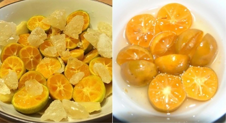 Bước đầu tiên, mẹ chuẩn bị vài là hẹ tươi rửa sạch, ngâm nước muối loãng, thái nhỏ. Tiếp theo, bổ tư 3 trái quất bao tử. Cho lá hẹ, quất, đường phèn vào một chén con, đem chưng cách thủy cho các tinh chất thấm đều. Mẹ cũng có thể cho vào nồi cơm đến khi sôi thì lấy ra để nguội.